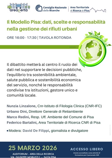 Il 25 Marzo 2026 Retiambiente Spa sarà presente alla tavola rotonda di presentazione del libro “Il Modello Pisa: dati, scelte e responsabilità nella gestione dei rifiuti”, che si terrà alle ore 16 presso l’Auditorium – Area della Ricerca del CNR di Pisa, in via Giuseppe Moruzzi 1.